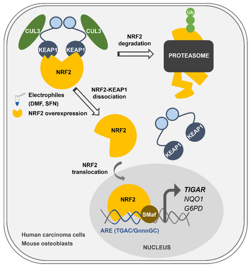 Graphical abstract of the main findings of this work. Transcriptional regulation of TIGAR by NRF2 in human and mouse cells. Upon exposure to the electrophilic molecules SFN and DMF, or after NRF2 overexpression, NRF2 is liberated from KEAP1 and translocates to the nucleus. NRF2 forms heterodimers with sMafs proteins in antioxidant response elements (AREs) located at the promoter of TIGAR and other antioxidant genes such as NQO1 and G6PD, enhancing their transcription.