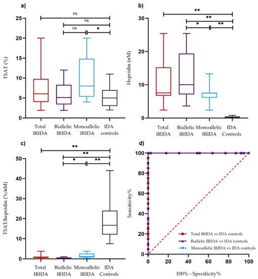 (a–c) Transferrin saturation (TSAT), plasma hepcidin levels, and TSAT/hepcidin ratio in the total IRIDA group (n = 20), biallelic IRIDA patients (n = 11), monoallelic IRIDA patients (n = 9) and IDA controls (n = 39). Box and whisker plots present the quartiles (box), the medians (bold line), and the minimum and maximum (whiskers). (d) Receiver Operating Characteristic (ROC) curve analysis (see also Supplemental Table S1) comparing the TSAT/hepcidin ratio (%/nM) in IDA controls versus the total IRIDA group (red), versus the biallelic IRIDA group (purple), and versus the monoallelic IRIDA group (blue). Ns, not significant; * = p < 0.05; ** = p < 0.001, by non-parametric Mann–Whitney U test. AUC, area under the curve.