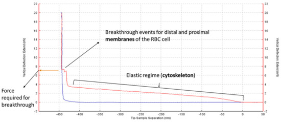 Atomic Force Microscopy (AFM) is a powerful tool that allows, in the force spectroscopy mode, direct measurements of mechanical resistance of any surface when the tip approaches it with a definite force, a process called ‘indentation’. In this case, given the small thickness of RBCs (~1 µm), our approach was to fully pierce through the cells by performing a maximum force of approximately 10–20 nN. Thus, we were able to measure and quantify membrane breakthrough events for the RBC membrane, with each curve typically showing two different sequential rupture events as the cell was completely pierced (an example can be seen in Figure 1), as mentioned in the Materials and Methods section.