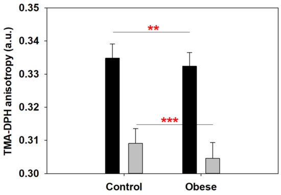 TMA-DPH anisotropy measurements of RBC membranes. The black bars represent measurements at 20 °C, while gray ones represent those at 37 °C. At both temperatures, a clear decrease for anisotropy values was detected for obese patient RBC, which indicates a higher membrane fluidity (n = 49 for control, n = 52 for obese). Average values ± S.D. Significance according to Student’s t-test: (**) p < 0.01; (***) p < 0.001.
