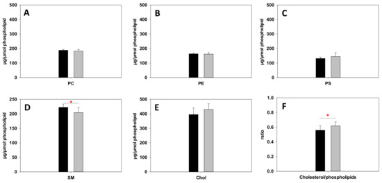 Lipidomic quantitation of specific lipid species in RBC. Species studied were PC (A), PE (B), PS (C), SM (D), and Chol (E). Chol/total phospholipid mol ratio is shown in panel (F). Black bars refer to control RBC group, while gray bars represent the obese patient RBC group. A significant decrease in SM and an increase in Chol/phospholipid ratio were detected for obese patient RBC. Average values ± S.D. Significance according to Student’s t-test: (*) p < 0.05. n = 8.