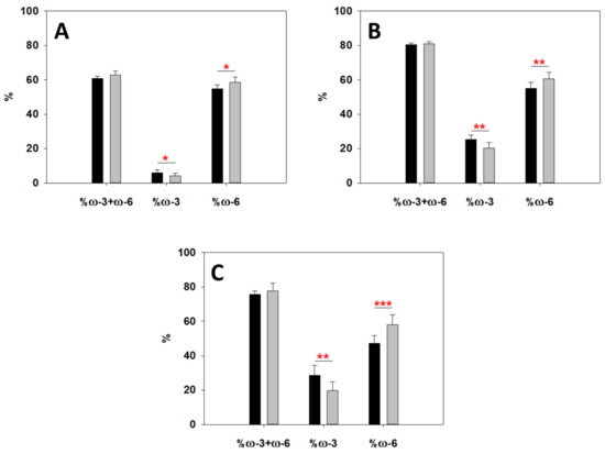 Lipidomic analysis of ω-3 and ω-6 presence in specific lipid species. Percent ω-3 and/or ω-6 in PC (A), PE (B), and PS (C). Black bars refer to control RBC group, while gray bars represent the obese patient RBC group. While total values for combined ω-3 + ω-6 are constant, both a decrease in ω-3 and an increase in ω-6 are detected for each lipid species in obese patient RBC. Average values ± S.D. Significance according to Student’s t-test: (*) p < 0.05; (**) p < 0.01; (***) p < 0.001. n = 8.
