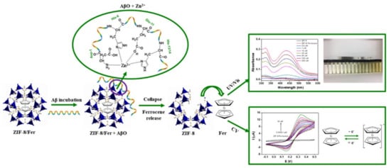 - Qin, J.; Cho, M.; Lee, Y. Ferrocene-Encapsulated Zn Zeolitic Imidazole Framework (ZIF-8) for Optical and Electrochemical Sensing of Amyloid-β Oligomers and for the Early Diagnosis of Alzheimer’s Disease. ACS Appl. Mater. Interfaces 2019, 11, 11743–11748. [Google Scholar] [CrossRef] [PubMed]