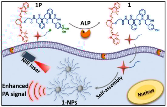 - Wu, C.; Zhang, R.; Du, W.; Cheng, L.; Liang, G. Alkaline Phosphatase-Triggered Self-Assembly of Near-Infrared Nanoparticles for the Enhanced Photoacoustic Imaging of Tumors. Nano Lett. 2018, 18, 7749–7754. [Google Scholar] [CrossRef]