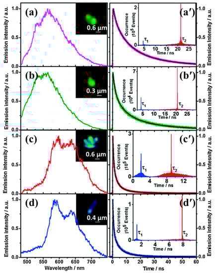 Emission (a–d) spectra and (a′–d′) decays of small T12-apo crystals. The insets in (a–d) show the fluorescence lifetime imaging (FLIM) images of the samples, and those in (a′–d′) give the lifetime distribution histogram. Reproduced with permission from the Royal Society of Chemistry, 2018.
