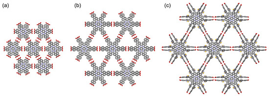 H-HexNet structures of: (a) Tp; (b) TpF; (c) TpMe. Crystallographically disordered parts in the frameworks are omitted for clarity.