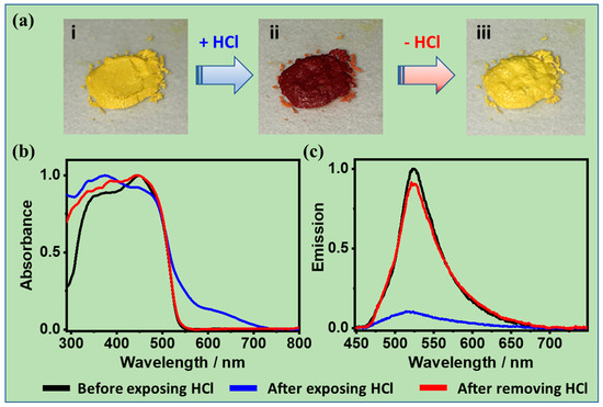 (a) Pictures showing the color changes of crystalline bulks of CPHATN-1a (i) before and (ii) after exposure to 37%-HCl, and (iii) after heating at 150 °C for 30 min. (b) Absorption and (c) emission spectra of solid CPHATN-1a upon exposure to HCl atmosphere for 40 min and after equilibrating the sample with ambient air for 48 h. Adapted with permission from the American Chemical Society, 2019.