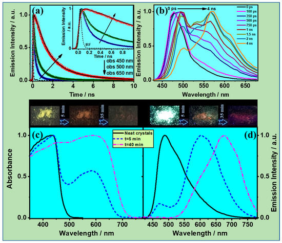 (a) Emission decays of solid CBPHAT-1a, recorded at the indicated wavelengths. The dashed signal is the IRF of the setup. (b) Normalized TRES of CBPHAT-1a in the solid-state at the indicated gating time. (c) Absorption and (d) emission spectra of CBPHAT-1a crystals before and after exposure to HCl atmosphere. The upper pictures in (c,d) show the color of the crystals before and after interaction with HCl atmosphere in ambient light and upon irradiation with a 360 nm lamp.