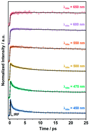 Fs-emission decays of ThiaHAT-1 in DMF suspension. The solid lines are from the best multiexponential global fit, and the IRF is the instrumental response function. This is an open access article under the CC BY-NC-ND license (http://creativecommons.org/licenses/by-nc-nd/4.0, accessed on 14 January 2022).
