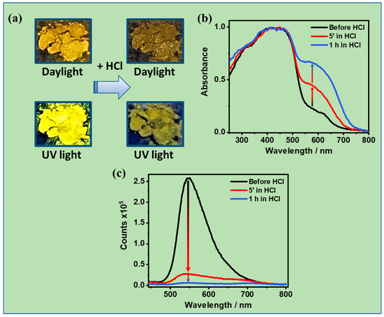 Acid responsiveness of ThiaHAT-1. (a) Photographs of the crystalline powder before (left) and after (right) being exposed to HCl under daylight (top) and UV light (365 nm, bottom). (b) Absorption and (c) emission spectra of ThiaHAT-1 before and after being exposed to vapors of HCl.