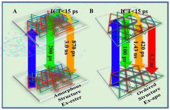 Schematic representation (not to scale) of the photodynamics of solid (A) Ex-ester and (B) Ex-apo showing the S0-S1 electronic transitions, involved processes, and relative time constants of the emission decays. The green, orange, and red arrows correspond to the fluorescence from LE, ICT, and anionic (only for the HOF Ex-apo) species, respectively. Reproduced with permission from the American Chemical Society, 2020.