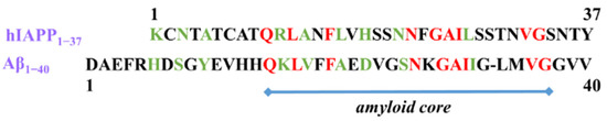 Sequence alignment of monomeric hIAPP1−37 and Aβ1−40. In both proteins, identical residual amino acids are marked in red and similar residues are highlighted in green.