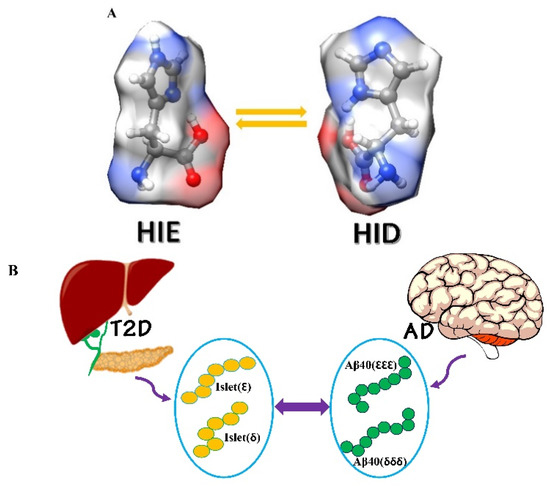 In addition to the self-interactions mediating amyloid self-assembly, cross-seeding interactions between different amyloidogenic peptides may also play a vital role in the progression and transmission between diverse brain degenerative disorders [1]. Alzheimer’s disease (AD) and type II diabetes (T2D) are the two most common aging-related, chronic neurodegenerative disorders, both of which affect millions of people globally [2,3,4]. Several epidemiological and clinical studies have shown a strong association between AD and T2D based on their characteristic disorder symptoms [5]. AD patients exhibit a higher risk of developing T2D and vice versa [6]. Multiple mechanisms have been suggested to explore the AD–T2D link pathophysiologically, involving vascular inflammation, insulin resistance and deficiency, loss of cells connected with degenerative alterations, and glucose toxicity [5]. However, the exact clinical relationship between AD and T2D is still elusive [7]. At the molecular and protein level, it was recently shown that the AD–T2D association could arise from the cross-talk between the causative proteins connected with the two diseases, namely amyloid-beta (Aβ) and human islet amyloid polypeptide (hIAPP) [8]. Aβ protein, derived by N-terminal proteolytic cleavage of the transmembrane amyloid precursor peptide (APP), is the chief component of senile plaques observed in the brain of the AD patient [9]. In addition, hIAPP, a 37-residue hormone protein synthesized by the islet β-cells is believed to be a causative factor for T2D, in which hIAPP-mediated amyloid aggregates were noticed in over 95% of T2D patients [1]. The exact functions of hIAPP and Aβ proteins in the pathogenesis of T2D or AD remain largely undetermined, but the disorder symptoms arise to connect well with the existence of tiny accumulates of hIAPP or Aβ, often designated as soluble oligomers [10,11]. Monomeric hIAPP and Aβ play a significant role in oligomer formation. Toxic Aβ and hIAPP oligomeric aggregates attack cells in diverse routes to cause cell dysfunction and even death [12,13]. From a sequential or conformational point of view, both Aβ and hIAPP share sequence identity and similarity of 25 and 50%, respectively (Figure 1). Under the disordered state, they both share several organizational, toxicity, and kinetic properties during amyloid generation [14,15]. First, both Aβ and hIAPP are present in the blood vessels and cerebrospinal fluid (CSF) incomparable nanomolar concentrations, hence an in vivo cross-connection among them is possible, which form heterogeneous Aβ−hIAPP aggregates [1]. Second, Aβ and hIAPP can misfold and accumulate into structurally similar U-bend fibrils, consisting of two β-strands joined by a small turn. This unique β-rich conformer may provide a common conformational basis to initiate the cross-seeding associations between Aβ and hIAPP [7]. As the toxicity of amyloidogenic proteins including Aβ and hIAPP has been connected to its accumulation, it is likely that the Aβ−hIAPP accumulates may also possess some neurotoxicity. Regardless of the precise relation between AD and T2D, it is equally important to design some effective compounds to inhibit the formation of neurotoxic cross-talking amyloids [16]. Numerous in silico, in vivo, and in vitro studies have been conducted on Aβ and hIAPP cross-seed fibrillization. However, the exact correlation between the Aβ–hIAPP associations is still under investigation [17]. Wetzel and colleagues investigated the cross-talking connections between Aβ and hIAPP in vitro. They observed that the Aβ accumulates were good seeds for hIAPP fibrillization, but hIAPP seeds were almost inactive for Aβ accumulation, exhibiting distinct cross-interacting efficiencies based on the seeding fibrillar structure [18]. Furthermore, Andreetto et al. reported that hIAPP1−37 and its segments can connect with Aβ1−40 to form heterocomplexes that affect neurotoxic self-assembly by both peptides [14,19]. Seeding concentrations, solution conditions, sequence specificity, and agitation are the possible factors that may influence Aβ−hIAPP cross interaction [16]. Another aspect that may have an important effect is histidine tautomerization, which has been shown to play an important role in peptide aggregation. Neutral and protonated states of histidine are correlated with conformational features of diverse misfolded systems and can affect the fibrillization pathways in proteins, leading to proteopathies [20,21,22,23,24,25,26,27,28,29,30,31,32]. Surprisingly, there are few simulation studies on the cross-seeding of Aβ and hIAPP monomers to mimic the initial co-accumulation of both proteins [33,34]. In the current work, the influences of various histidine tautomeric forms on the cross-seeding of monomeric Aβ1−40 and hIAPP were investigated.