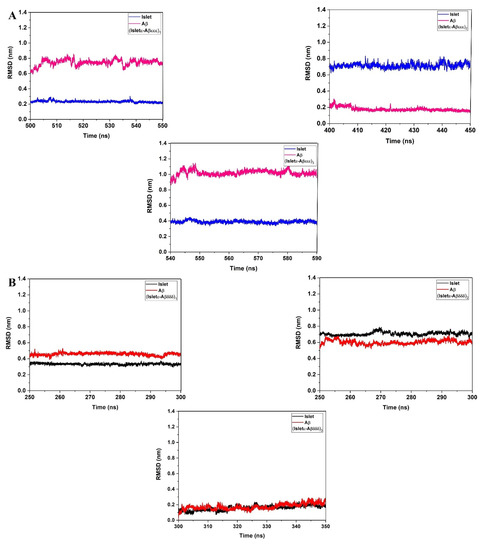 To get detailed information on the secondary structure of each random seed and chain, the calculated β-sheet and α-helix content are shown in Figure 5C,D. As it was depicted in Figure 5A,C,D, the Islet(ε) only in one seed showed the 10% of β-sheet formation among all seeds for both isomeric forms of amylin compared with to no β-sheet before cross interactions. Meanwhile, the α-helix amount slightly increased within the two seeds. In Islet(δ), the two seeds exhibited an increasing trend for the α-helix compared with the monomeric isomer and reached 40%. However, in the first seed, it decreased to around 21%. Regarding the Aβ(εεε) isomer, only the third seed showed 1% of β-sheet formation during dimerization while the others remained without sheet content, the same as the monomeric form. In addition, in cross interaction between Aβ(δδδ) with Islet(δ) and Islet(ε), Aβ(δδδ) in all seeds except the second seed that the β-sheet content of Aβ(δδδ) maintained the same amount as the initial monomeric structure revealed the increased amount (highest ~38%). Results may indicate that the amylin affected the Aβ40 β-sheet formation in the case of Aβ(δδδ) more by enhancing the content (except one seed) and this isomer could maintain its initial sheet amount and even experience increasing content. However, only one seed in the amylin isomer showed small β-sheet formation so probably the Aβ40 isomer also shows more stability than that of the amylin due to lower flexibility in β-sheet regions [45,52]. The results may also indicate the possibility of enhancing the toxicity of Aβ40(δδδ) due to increasing the β-sheet content in the presence of islet isomers and risk of AD. The clearance rate of Aβ in the brain of AD patients is notably lower than normal people [53]. Due to the histidine tautomeric effect on the structural characteristics of the amyloid and amylin that lead to the Aβ40(δδδ) isomer with a high content of β-sheet as a remarkable characteristic, we could speculate that this isomer of Aβ40 may participate more to form the higher-order oligomers and fibrils than other isomers and may facilitate further aggregation and insoluble structures generation. The Aβ structures rich in β-sheet could act as neurotoxic agents. This high aggregation potency may affect and change the clearance and balance pathway.