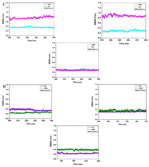 Root mean square deviation (RMSD), (A) Islet(ε)-Aβ40(εεε), (B) Islet(ε)-Aβ40(δδδ), (C) Islet(δ)-Aβ40(εεε), and (D) Islet(δ)-Aβ40(δδδ) cross-seeds.