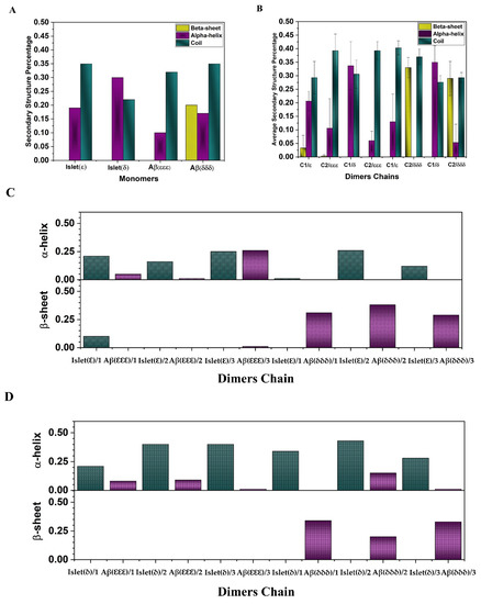 A computational study on amylin-Aβ42 mixture interaction has revealed the heterodimers as the most dominant species at the initial stages of assembly before converting to the heterohexamer [51]. The initial structures of amylin-Aβ40 dimers that were used for MD simulations in the current work are shown in Figure 3. After performing the MD, considering the (root mean square deviation) RMSD plots (Figure 4) for all three random seeds of the possible isomeric combinations the last 50 ns of the equilibrated part was taken for further structural analysis. The secondary structure analysis using the dictionary of secondary structures of proteins (DSSP) algorithm was applied on the equilibrated section of the trajectories. Before conducting the MD simulation, the β-sheet, α-helix, and coil content of the monomers were calculated and shown in Figure 5A. The β-sheet only can be observed in the Aβ(δδδ) monomer (~20%) and Islet(δ) has the highest α-helix content (~30%) while in the other monomers the coil structure is the dominant form.