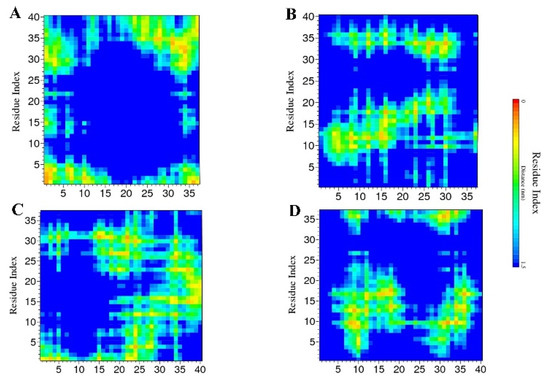 In all four maps, the residues in the N-terminal region of Aβ40 (D1-K16) exhibited some possible interactions with the amylin chain as it has been mentioned in another report in the case of Aβ42 and amylin cross-seeding as well that imply the importance of the N-terminals of both isomers during cross-interaction [45], which can be sometimes in favor of cross-interaction and other times they can be unfavorable [45]. Also, as it has been shown in another work, regarding the importance of residues L17-V24 and N27-A42 in Aβ42 and residues A8-H18 and N22-S28 for cross- and self-assembly [51], in the current maps we can see the interactions including these regions as well.