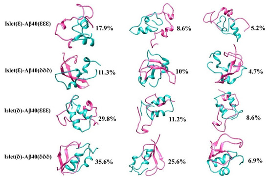 Representative structures and the percentage of distribution based on clustering of the selected seeds of each dimer conformation (Islet(ε)-Aβ40(εεε) 1st, Islet(ε)-Aβ40(δδδ) 2nd, Islet(δ)-Aβ40(εεε) 2nd and Islet(δ)-Aβ40(δδδ) 1st seed). The amylin and Aβ40 structures are shown in light green and hot pink, respectively.