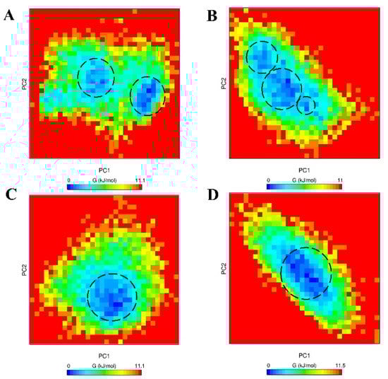 To clarify the conformational states of the dimers, the Gibbs free energy landscape was obtained using 2D projection of first (PC1) and second (PC2) eigenvectors. The principal component analysis (PCA) can determine the global motions of a protein within a few motions [57,58,59]. The color-coded FELs are represented in Figure 8. Analysis using the GROMACS v.5.0 software [56] exhibited the ΔG values vary between the range 0 to 11~11.5 kJ/mol for the chosen seeds of each dimer category. It can be determined that Islet(ε)- Aβ40(εεε) 1st and Islet(ε)-Aβ40(δδδ) 2nd may switch to assorted conformations as compared with other two structures due to more separated local minima and a higher energy barrier, which seems in agreement with the cluster analysis that implied the diverse conformations for these two dimers.