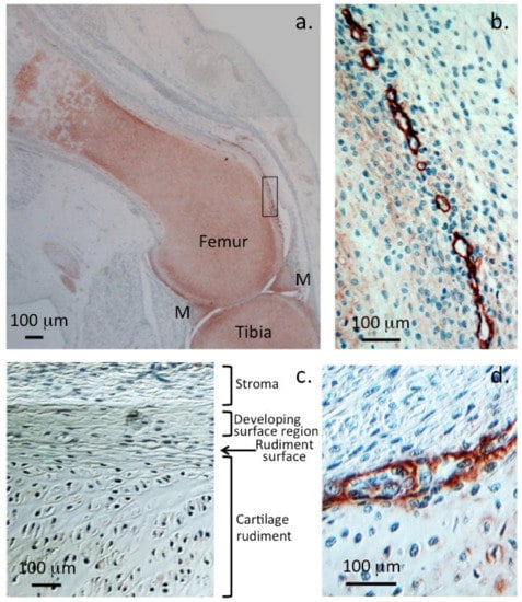 Localisation of perlecan in human foetal knee joints (12 weeks gestational age). Immunolocalisation of HSPG2 with perlecan domain-1 MAb A76 in a 12-week-old gestational age human foetal knee demonstrating perlecan as a major extracellular matrix proteoglycan of the tibial and femoral cartilaginous rudiments (a) and menisci (M). Perlecan is also prominently localised around the margins of small chondroprogenitor cell niches in the stromal tissue surrounding the rudiment (b). Nomarski differential interference contrast images demonstrate the differing stromal, surface, and central cartilaginous rudiment cell morphologies (c). Detail of a chondroprogenitor niche at the interface of the stromal and rudiment surface with perlecan prominently located around the niche (d). Chromogen NovaRED, nuclei stained with haematoxylin. Photosegments modified from [] with permission © Melrose 2016.