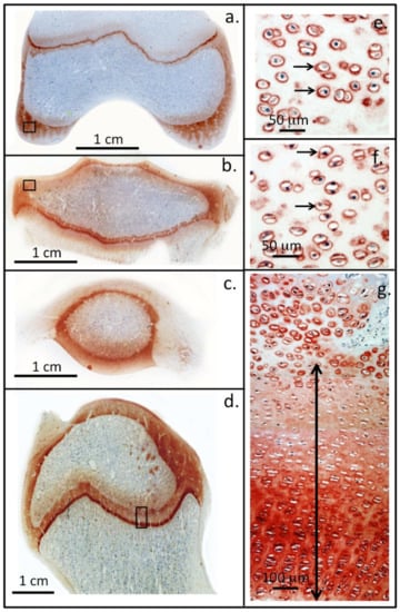 - Melrose, J.; Isaacs, M.D.; Smith, S.M.; Hughes, C.E.; Little, C.B.; Caterson, B.; Hayes, A.J. Chondroitin sulphate and heparan sulphate sulphation motifs and their proteoglycans are involved in articular cartilage formation during human foetal knee joint development. Histochem. Cell Biol. 2012, 138, 461–475. [Google Scholar] [CrossRef]