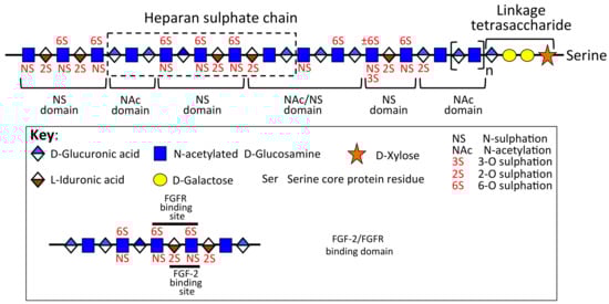 Schematic depiction of the domain organization of a hypothetical HS chain showing the FGF-2 and FGFR binding domain. Figure modified from [,].