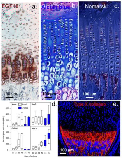 Immunolocalisation of FGF-18 and type X collagen in growth plate cartilage. Upregulation of FGF-18 immunolocalised in hypertrophic growth plate chondrocytes (a), with their enlarged morphologies clearly visualized by alcian blue staining (b) and in a Masson’s trichrome image viewed under Nomarski differential interference contrast optics (c). Gene profiling shows that FGF-18 initially stimulates chondrogenesis in bone marrow chondroprogenitor cells up to day 30 in micromass pellet culture but by day 31, type II collagen expression ceases and osteogenic differentiation (Mef2c) is initiated (d). FGF-2, however, maintains chondrogenesis throughout the full period of pellet culture (up to day 41). Type X collagen synthesis occurs in FGF-18-stimulated cultures from day 31 and is clearly evident at the chondro-osseous junction (e). FGF-18 also upregulates Snail1 expression in the hypertrophic growth plate chondrocytes. Images (a–d) ©Melrose 2016, reproduced from [] with permission. Images Image (e) supplied courtesy of DrYao Hao, © Yao Hao 2019, Institute of Genetic Medicine, International Centre for Life, Newcastle University, UK.