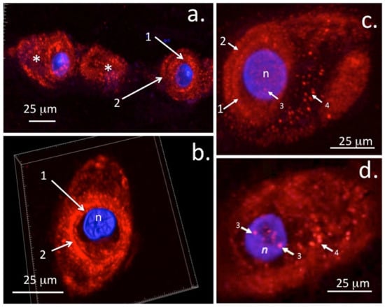 Immunolocalisation of perlecan in ovine AF and NP chondrons using laser scanning confocal microscopy and 3D rendered image stacks. Nuclear DAPI counterstaining is shown in blue. Fluorescent perlecan immunolocalisations were undertaken as described in []. A string of outer AF cells (a) and 3D reconstructions of perlecan in an NP chondron with 3D volume indicated by white boundary box (b). Immunolocalisation of perlecan in a stacked confocal image of an NP chondron (c) and in a 0.5 µm single z-stack image depicting punctate nuclear perlecan deposits (d). These deposits are obscured in the stacked image (c) by overlying tissue. Key: 1. Pericellular matrix, 2. Type VI Collagenous capsule, 3. Nuclear deposits of perlecan, 4. Vesicular perlecan transported out of the cell into the chondron matrix (*). n = nucleus. Figure reproduced under Open Access CC-BY-SA licence from [] © the authors 2020.
