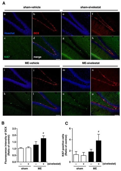 (A) Images of triple staining (merge, (d,h,l,p)) for DCX (red, (b,f,j,n)) and Ki67 (green, (c,g,k,o)), and with Hoechst 33342 (blue, (a,e,I,m)) for the vehicle-treated sham and ME groups and sivelestat-treated sham and ME groups on day one after surgery are shown. The scale bar represents 100 μm. (B) The fluorescence intensity of DCX in the vehicle-treated (−) sham- (white bars) and ME-operated (black bars) groups and sivelestat-treated (+) sham- (white bars) and ME-operated (black bars) groups on day one after surgery was measured. Five sections were made per animal, and the average of five sections per animal was calculated. The values for fluorescence intensity of DCX cells are presented as the mean ± SD (n = 5 each). (C) The number of Ki67-positive cells in the hippocampal dentate gyrus of the vehicle-treated (−) sham- (white bars) and ME-operated (black bars) groups and sivelestat-treated (+) sham- (white bars) and ME-operated (black bars) groups on day one after surgery was counted. The results are expressed as the mean ratio of the non-operated (control) group ± SD (n = 5 each). # Significant difference from the vehicle-treated ME group (p < 0.05).