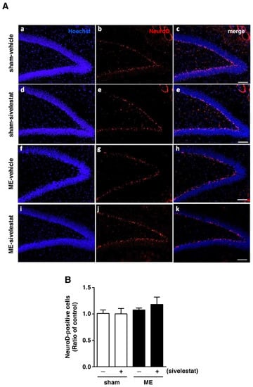 (A) Images of double-stained sections (merge, (c,e,h,k)) for Neuro D (red, (b,e,g,j)), and with Hoechst 33342 (blue, (a,d,f,i)) for the vehicle-treated sham and ME groups and sivelestat-treated sham and ME groups on day one after surgery are shown. The scale bar represents 100 μm. (B) The number of NeuroD-positive cells in the hippocampal dentate gyrus of the vehicle-treated (−) sham- (white bars) and ME-operated (black bars) groups and sivelestat-treated (+) sham- (white bars) and ME-operated (black bars) groups on day one after surgery was counted. Results are expressed as the mean ratio of the non-operated (control) group ± SD (n = 5 each).