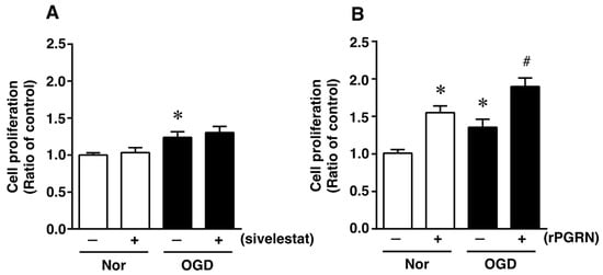 Cell proliferation of neural stem/progenitor cells in the vehicle-treated (−) normoxia (white bars) and OGD (black bars) groups and sivelestat (A)- or rPGRN (B)-treated (+) normoxia (white bars) and OGD (black bars) groups is shown. Cell proliferation of neural stem/progenitor cells was determined by performing the XTT assay. Results are expressed as the mean ratio of the non-treated (control) group ± SD (n = 5 each). * Significant difference from the vehicle-treated normoxic group (p < 0.05). # Significant difference from the vehicle-treated OGD group (p < 0.05).
