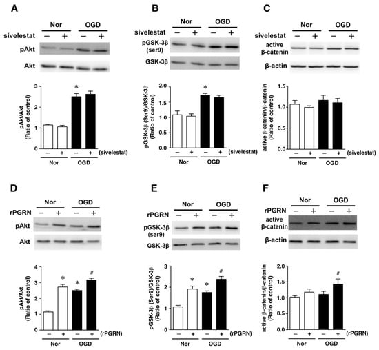 Levels of pAkt (A,D), pGSK-3β (B,E), and active-β-catenin (C,F) in the vehicle-treated (−) normoxia (white bars) and OGD (black bars) groups and sivelestat- (A–C) or rPGRN (D–F)-treated (+) normoxia (white bars) and OGD (black bars) groups at 24 h after OGD are shown. Bands corresponding to pAkt, pGSK-3β, and active-β-catenin were scanned, and the scanned bands were normalized by total Akt, GSK-3β, and β-actin on the same blot, respectively. Results are expressed as the mean ratio of the non-treated (control) group ± SD (n = 5 each). * Significant difference from the vehicle-treated normoxic group (p < 0.05). # Significant difference from the vehicle-treated OGD group (p < 0.05).