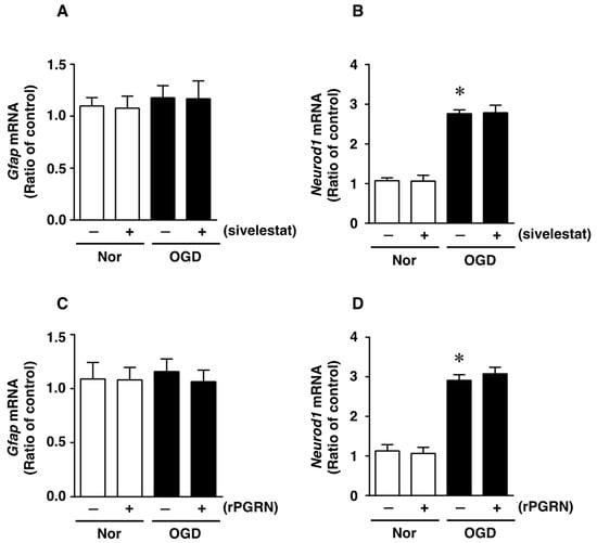 Levels of Gfap (A,C) and NeuroD1 (B,D) mRNAs in the vehicle-treated (−) normoxia (white bars) and OGD/R (black bars) groups and sivelestat- (A,B) or rPGRN (C,D)-treated (+) normoxia (white bars) and OGD/R (black bars) groups at 72 h after OGD/R are shown. Results are expressed as the mean ratio of the normoxia or OGD/R to the control group ± SD (n = 5 independent experiments). * Significant difference from the vehicle-treated normoxic group (p < 0.05).