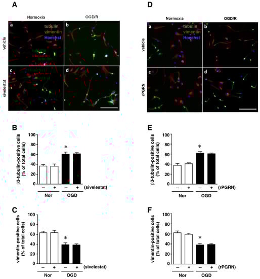 (A,D) Images of double staining for vimentin (red) and β3-tubulin (green), and with Hoechst3342 (blue), for the normoxia-vehicle (A-a,D-a), normoxia-sivelestat (A-c), and -rPGRN (D-c) groups, as well as those for the OGD/R-vehicle (A-b,D-b), OGD/R-sivelestat (A-d), and OGD/R-rPGRN (D-d) groups are shown. The scale bar represents 100 μm. The numbers of β3-tubulin- (B,E) and vimentin-positive cells (C,F) for vehicle-treated (−) normoxia (white bars) and OGD/R (black bars) groups and for sivelestat (B,C)- or rPGRN (E,F)-treated (+) normoxia (white bars) and OGD/R (black bars) groups at 96 h after OGD/R were counted. The results are expressed as the percentage of vimentin-positive cells among the total number of Hoechst-positive cells and that of β3-tubulin-positive cells among the total number of Hoechst-positive cells, and as the means ± SD (n = 5 independent experiments. The total number of Hoechst-positive cells counted was 7148 (A-a; vehicle) and 7464 (D-a; vehicle); 7046 (A-c; sivelestat) and 7463 (D-c; rPGRN) for the normoxia group; 7614 (A-b; vehicle) and 7658 (D-b; vehicle); and 7600 (A-d; sivelestat) and 7590 (D-d; rPGRN) for the OGD/R group. * Significant difference from the vehicle-treated normoxic group (p < 0.05).