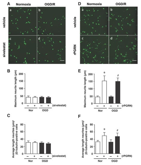 (A,D) Staining results for β3-tubulin in the normoxia-vehicle group (A-a,D-a), normoxia-sivelestat (A-c), and -rPGRN (D-c) groups, as well as those for OGD/R-vehicle (A-b,D-b), OGD/R-sivelestat (A-d), and OGD/R-rPGRN (D-d) groups are shown. The scale bar represents 100 μm. The maximum neurite length (B,E) and average length of neurites (C,F) for the vehicle-treated (−) normoxia (white bars) and OGD/R (black bars) groups and sivelestat (B,C) or rPGRN (E,F)-treated (+) normoxia (white bars) and OGD/R (black bars) groups at 96 h after OGD/R were measured. The results are expressed as the means (μm) ± SD of these cells among the total number of β3-tubulin-positive cells (n = 5 independent experiments. The total number of β3-tubulin-positive cells counted was 2738 (A-a; vehicle) and 2692 (D-a; vehicle); 2709 (A-c; sivelestat), and 2896 (D-c; rPGRN) for the normoxia group; 4654 (A-b; vehicle) and 4702 (D-b; vehicle); and 4665 (A-d; sivelestat) and 4621 (D-d; rPGRN) for the OGD/R group. * Significant difference from the vehicle-treated normoxic group (p < 0.05). # Significant difference from the vehicle-treated OGD group (p < 0.05).