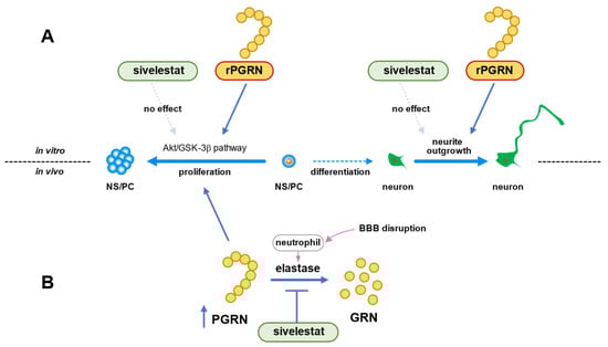 (A) Schematic diagram of effects of PGRN or sivelestat on proliferation of NS/PC and neurite growth of neurons that had differentiated from NS/PC in vitro ischemic condition. (B) Schematic diagram of effects of sivelestat on proliferation of NS/PC after in vivo cerebral ischemia.
