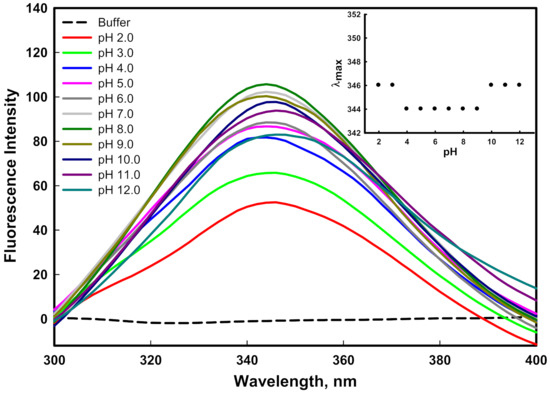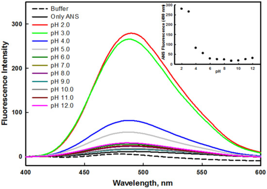 Fluorescence spectroscopy provides information about the tertiary structure of a protein due to the presence of aromatic amino acids, which are highly sensitive to the local environment. The change in the emission spectra of the mutant G protein at different pH values is shown in Figure 3. A considerable decrease in emission intensity was noticed as we moved from physiological pH to acidic pH values (pH 8.0–2.0). The decrease in emission intensity may have been due to the quenching mechanism, the protonation of water molecules, or acidic amino acids present in the surrounding intrinsic fluorophores. Similarly, a considerable decrease in emission intensity was noticed as we moved from physiological pH to basic pH values (pH 8.0–12.0), which might have been due to the deprotonation of basic amino acids that surrounded the intrinsic fluorophore and caused fluorescence quenching. The protonation and deprotonation changed the charge in the local milieu by altering electrostatic interactions and internal salt bridges that were present in native protein [43]. The emission spectra of the protein at pH 8.0 showed an emission maxima peak (λmax) at 344 nm, which is the native conformation of the protein. The plot of λmax as a function of pH showed no considerable change in the λmax of the protein from pH 4.0–9.0. This can be attributed to the microenvironment around the aromatic amino acid not being disturbed significantly. However, in highly acidic conditions (pH 2.0–3.0) and highly basic conditions (pH 10.0–12.0), a slight redshift of 2 nm from 344 to 346 in the λmax was observed (inset of Figure 3). A redshift in emission maxima is indicative of the increased solvent interactions of aromatic amino acids due to the unfolding of the protein [44]. Previously, we reported that the wild-type G protein showed a redshift of 5 nm in the λmax only at pH 12.0 [45]. Finally, our fluorescence study concluded that the tertiary structure of the protein was perturbed as we moved from the physiological pH to the acidic or basic pH values, and changes in the λmax were observed in highly basic and acidic pH conditions.