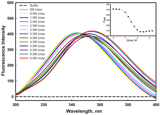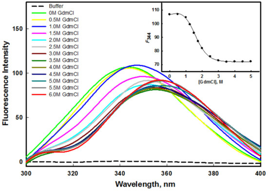 The stability of a protein can be quantified by equilibrium unfolding measurements in the presence of urea or GdmCl [49,50]. The aromatic amino acid of the protein, which is often fully or partially buried in the hydrophobic core of the protein, serves as an indicator of the structural integrity of the protein. The stability of the protein was measured using intrinsic tryptophan, which is an important probe. Figure 5 and Figure 6 show the emission spectra of the mutant G protein with increasing concentrations of GdmCl and urea, respectively. We observed that the emission spectra of the protein changed as we increased the concentration of GdmCl and urea. As we increased the concentration of the denaturant, the fluorescence intensity decreased with the shifting of the emission maxima (λmax) toward the higher wavelength (redshift). The spectra of the protein in the absence of a denaturant showed an emission maxima (λmax) peak at 344 nm; however, at a higher concentration of denaturant, the λmax of the protein was shifted to 356 nm. From these results, we inferred that the aromatic amino acids of the protein were shifted from nonpolar to polar environmental conditions, as the GdmCl and urea (denaturants) exposed the buried aromatic amino acid residues [51]. Our results also suggested that as we increased the GdmCl or urea concentration, unfolding of the protein occurred, which exposed the buried tryptophan residues to a more polar buffer condition. The alteration in the microenvironment of tryptophan was monitored using F344 (fluorescence emission intensity at 344 nm) as a function of GdmCl (inset of Figure 5) and urea (inset of Figure 6). The plots of F344 versus [GdmCl] and [urea] showed that the denaturation process in the presence of the denaturant followed a two-state process. The denaturation transition curves were examined to obtain the value of stability parameters such as ∆GD0 (Gibbs free energy change in the absence of denaturants), m (slope), and Cm (transition midpoint of denaturation curve) by fitting the entire denaturation curve to Equation (1). The thermodynamic stability parameters of mutant G protein are given in Table 1.