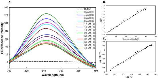 Fluorescence spectroscopy is a very simple and sensitive technique to study protein–ligand interactions. It is mainly used to determine the number of binding sites (n), Stern-Volmer constant (Ksv), binding constant (K), and interaction mechanism between a protein and ligand. For binding measurements, the protein sample was excited at 280 nm. Excitation of a protein at 280 nm is considered as fluorescence of tyrosine, tryptophan, and phenylalanine [55]. Figure 7A shows the emission spectra of the mutant G protein with an increasing (0–40 µM) concentration of heparan sulfate (HS). The HS did not flourish alone, whereas the protein showed a peak of maxima (λmax) at 344 nm in the same environment. The fluorescence intensity of the protein gradually decreased as we increased the concentration of HS, suggesting the formation of a complex between the ligand and protein. The experimental data were analyzed to calculate the Ksv using Equation (2). Figure 7B represents the Stern–Volmer plots of protein quenching in various concentrations of heparan sulfate. The Ksv value was obtained using Equation (2) by fitting the fluorescence intensity ratio F0/F for various concentrations [C] of HS. The quenching mode was further confirmed from the value of Kq (bimolecular quenching constant) using Equation (3). The experimental data were further analyzed by using Equation (4), which showed the binding constant (K) value (Figure 7C). The binding interaction parameters of HS with the mutant G protein are given in Table 2.