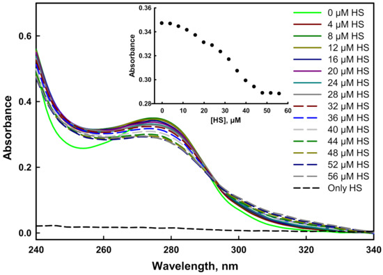 In a protein, the presence of a conjugated bond system in the side chain of aromatic amino acids acts as a chromophore that absorbs UV light in the range of 240–340 nm [56]. The mutant G protein contains five tyrosine residues, which showed an absorption maxima peak at 278 nm. The alteration in the tertiary structure of the protein with the addition of HS indicated binding of the ligands to the target protein [57]. The absorption spectra of mutant protein gradually decreased as we increased the concentration of HS, suggesting the binding of the ligand with the protein (Figure 8). It was noted that the quenching stopped after the addition of 48 µM of HS, which was an indication of the formation of a stable complex (inset of Figure 8). Similar to the mutant protein, the absorbance spectra of wild-type G protein decreased with an increasing concentration of HS, as reported in our previous investigation [45].