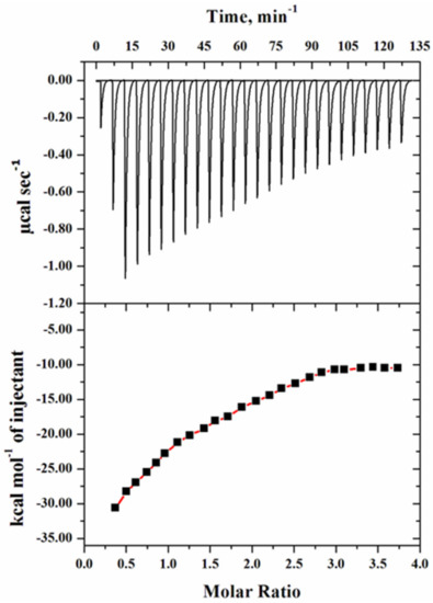 We observed a significant difference between the thermodynamic parameters of fluorescence and ITC. It is well known that fluorescence measures only the local changes around the microenvironment of the fluorophore upon ligand binding, whereas on the other hand, ITC monitors the global changes in terms of heat released or absorbed during the breaking or formation of bonds upon ligand–protein interactions [59]. Variations in thermodynamic parameters derived from fluorescence and ITC have been seen in several other ligand–protein interaction studies [60,61,62].