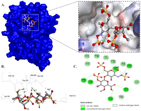 Molecular docking of heparan sulfate with the mutant G protein was performed to determine the binding energy, as well as to identify the specific amino acid residues involved in ligand binding and their intramolecular distances. The heparan sulfate occupied the binding site pocket of the mutant G protein and formed a single hydrogen bond with Asn1127, Pro132, Thr133, Ser191, and Glu226, and triple hydrogen bonds with Thr134. In addition, HS also formed two carbon–hydrogen bonds with Pro132 and Arg196 (Figure 10A,C). The intramolecular distance between the ligand and protein was found to be in the range of 2.03 Å to 2.77 Å (Figure 10B). The HS showed a binding energy of −6.4 kcal/mol with the mutant G protein. The binding constant (Kb) value was calculated using the value of the binding energy, and was found to be 4.9 × 104/mol. The binding parameters of HS with the mutant G protein are given in Table 4.