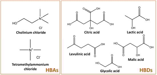 [Ch]Cl, [N1111]Cl, [Ch]Br and [Ch]Ac were used as hydrogen bond acceptors (HBAs) while citric, malic, levulinic, lactic and glycolic acids were used as hydrogen bond donors (HBDs). The HBAs and HBDs were weighted in glass vials in the desired molar ratio. The water content of both components was determined using a Metrohm 831 Karl Fisher coulometer and considered during weighting. The mixtures were then heated up to 70 °C and stirred for at least 1 h until a transparent liquid was formed. Mixtures were cooled down to room temperature and kept in sealed glass vials up to use.