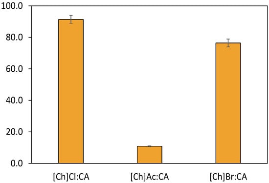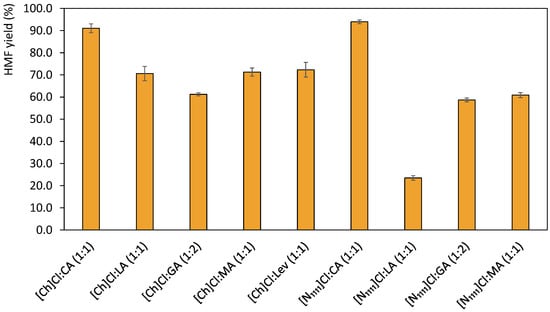 As observed in Figure 1 yields above 50% were attained for all DES combinations, with the exception of [N1111]Cl:LA (1:1). Moreover, when comparing the HBAs [N1111]Cl and [Ch]Cl, the latter generally promotes higher 5-HMF yields, with the exception of the DES with GA and CA in which very similar 5-HMF yields were obtained. Citric acid was the HBD that resulted in the best yields for both HBAs, namely 91.03% for [Ch]Cl:CA and 93.93% for [N1111]Cl:CA. The high yields reached in these cases could be mainly related to the use of citric acid as HBD. This acid has the lowest pKa and is a tricarboxylic acid, thus resulting in a faster promotion of the dehydration reaction []. The results attained surpass those obtained by Han and co-workers [] with [Ch]Cl:CA, in which they reported 75% of yield during 1 h at 80 °C under conventional heating []. This difference in yield can be attributed to the use of microwave-assisted reactions, as well as to the DES thermal stability and capacity to absorb microwave radiation.
