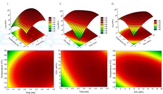 Time is the second most relevant parameter, according to the Pareto chart, and through the analysis of Figure 4i,ii. In Figure 4ii the highest 5-HMF yields are attained in a time window spanning from 3.5 to 5 min, while in Figure 4i the time interval narrows considerably when taking temperature into account. Consequently, higher 5-HMF yields are attained between 3 and 4 min of reaction time. Finally, GVL wt.% is the least relevant parameter as shown in the Pareto chart, being the same observed by analyzing Figure 4ii,iii. The results attained reveal that the addition of GVL has a similar effect from 10 wt.% up to almost 18 wt.%. Nonetheless, and once more, this range is narrowed when temperature is considered (Figure 4iii). It is also interesting to see that the use of GVL could be tailored to the other conditions. For example, the amount of GVL can be varied according to the reaction time, as displayed in Figure 4ii, with an inverse relationship. Since the temperature is fixed at 130 °C in this Figure, the low yields with smaller amounts of GVL could be related to 5-HMF degradation. On the other hand, at lower temperatures, an increase in the amount of GVL used could contribute to increase 5-HMF yields, as seen in Figure 4iii.