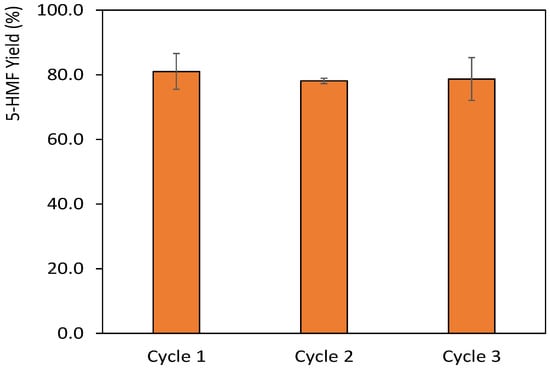 5-HMF yields attained through 3 cycles involving the solvent reuse of the system composed of [Ch]Cl:Citric Acid (1:1) with 10 wt.% of GVL. The microwave-assisted reactions were carried out at 130 °C with 4 min of reaction and S/L ratio of 0.05.