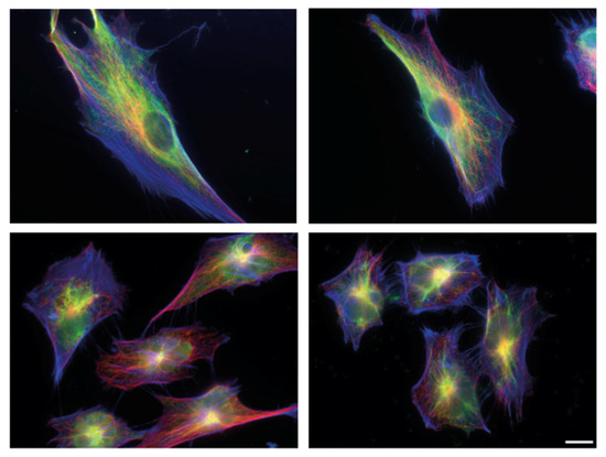 - Eckes, B.; Dogic, D.; Colucci-Guyon, E.; Wang, N.; Maniotis, A.; Ingber, D.; Merckling, A.; Langa, F.; Aumailley, M.; Delouvée, A.; et al. Impaired mechanical stability, migration and contractile capacity in vimentin-deficient fibroblasts. J. Cell Sci. 1998, 111, 1897–1907. [Google Scholar] [CrossRef]
