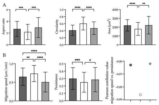 The statistical analysis of aspect ratios was performed in GraphPad Prism version 9.1.0 (GraphPad Prism Software, San Diego, CA, United States). All of the data were non-parametric, and therefore Mann–Whitney U tests were used to compare the experimental groups. For the migration analysis, Student’s t-tests were used to determine the p-values between experimental conditions. A python script was written to calculate the p-values using the scipy.stats module and its function ttest_ind() (documentation for ttest_ind(): https://docs.scipy.org/doc/scipy/reference/generated/scipy.stats.ttest_ind.html (accessed on 15 October 2021)). The correlation between the mean migratory speed and the persistence of each cell and under condition was obtained using pythons scipy.stats module using the pearsonr() function (documentation for pearsonr(): https://docs.scipy.org/doc/scipy/reference/generated/scipy.stats.pearsonr.html (accessed on 15 October 2021).