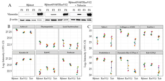 Vimentin has been proposed to act as a platform for the binding of proteins, in order to thereby regulate intracellular signalling [28,29]. To determine how oncogenes and HDAC6 affect the vimentin interactome, and to indicate any potential regulators of the vimentin-dependent control of cell shape and motility, we analysed the vimentin interactome in the metastasising BjhtertSV40TRasV12 cells without and with tubacin treatment, and in the immortalised Bjhtert cells as a control. The intermediate filament fraction of the cell variants was first enriched to yield four subcellular fractions: membrane bound/soluble protein; cytoskeletal; highly salt-soluble supernatant; and insoluble cytoskeleton (see Materials and Methods). The levels and quality of these four fractions are shown in Figure 4A, and the final fraction—fraction 4—was enriched in vimentin relative to β-actin (Figure 4A; Supplementary Figure S4). We then analysed the protein content of this vimentin-enriched fraction 4 using a label-free quantitative proteomics approach (Supplementary Dataset 1, with 555 proteins identified and relatively quantified by ≥2 unique peptides). In terms of overall composition, fraction 4 contained intermediate filament proteins, of which vimentin was the most abundant. Keratin 18, lamins A and B1, plectin and pinin were also detected. Proteins associated with integrin binding and interactions with the extracellular matrix—such as integrin β1, collagen α-1(VI), α-2(VI) and α-3(VI) chains, fibronectin, heparan sulphate proteoglycan core protein, talin 1 and CD44 antigen—were present. Bioinformatic comparisons of these data with online vimentin-interaction data (BIOGRID interaction database; https://thebiogrid.org/; accessed 20 October 2021) indicated that 50 of the proteins in the dataset are known interaction partners for vimentin, including plectin, keratin 18, the sequestosome-1 aggresome protein and the 14-3-3-ζ adaptor protein YWHAZ, which induces Rac1 activity and lamellipodia formation [30,31]. Together with the co-clustering of two biological and three technical replicates for each sample in the heatmap analysis (Supplementary Figure S5), these observations provide confidence in the dataset.