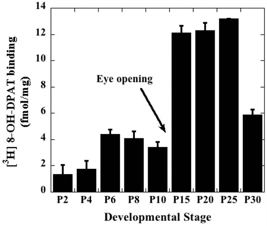 Agonist binding reveals the number of G-protein-coupled receptors that are actually involved in causing signaling activity. To the best of our knowledge, no rigorous receptor binding assay has been reported measuring the post-natal developmental profile of the hippocampal, G-protein-coupled 5-HT1A-R. Results shown in Figure 2 confirm that the expression of 5-HT1A-R undergoes a significant increase at two points of post-natal brain development in mice. The first sharp rise occurs at P6 and the second rise is observed between P10 and P15. It should be noted that the mice generally open their eyes at around P12, which is generally marked by a massive surge in neuronal activity in the brain. This could explain the massive increase in receptor expression between P10 and P15. Our earlier studies have confirmed that, at P15, the hippocampal 5-HT1A-R functions through PKC-independent activation of ERK1/2 to cause downstream stimulation of PKCα, which triggers synaptogenesis in the hippocampus [12,16].